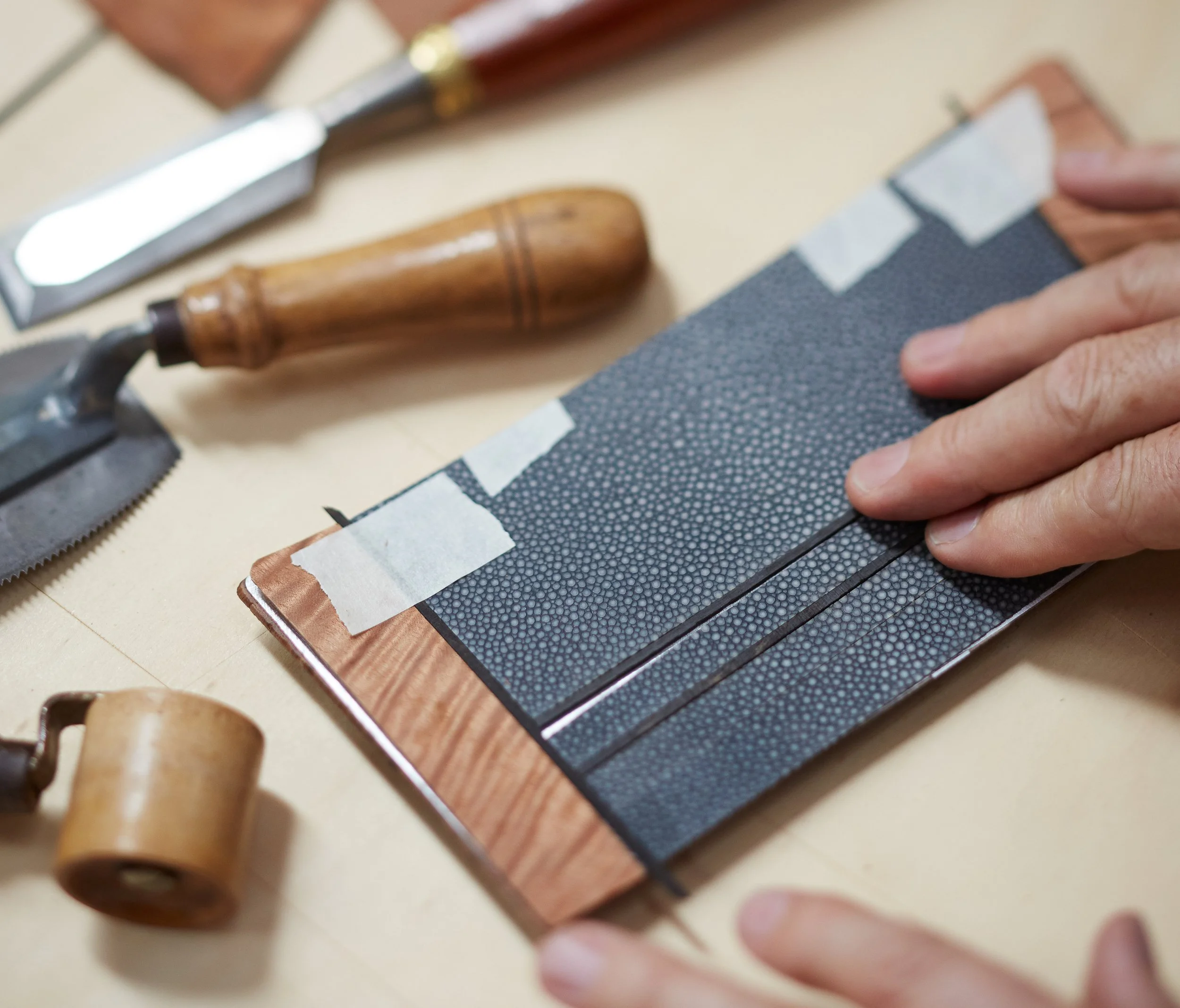 We work with rare materials including exotic veneers, vellum, shagreen, cast bronze, carved glass, and hand-stitched leather, to produce one-of-a-kind tables, desks, consoles and heirloom boxes. These often incorporate ingenious mechanical systems and custom-made hardware.