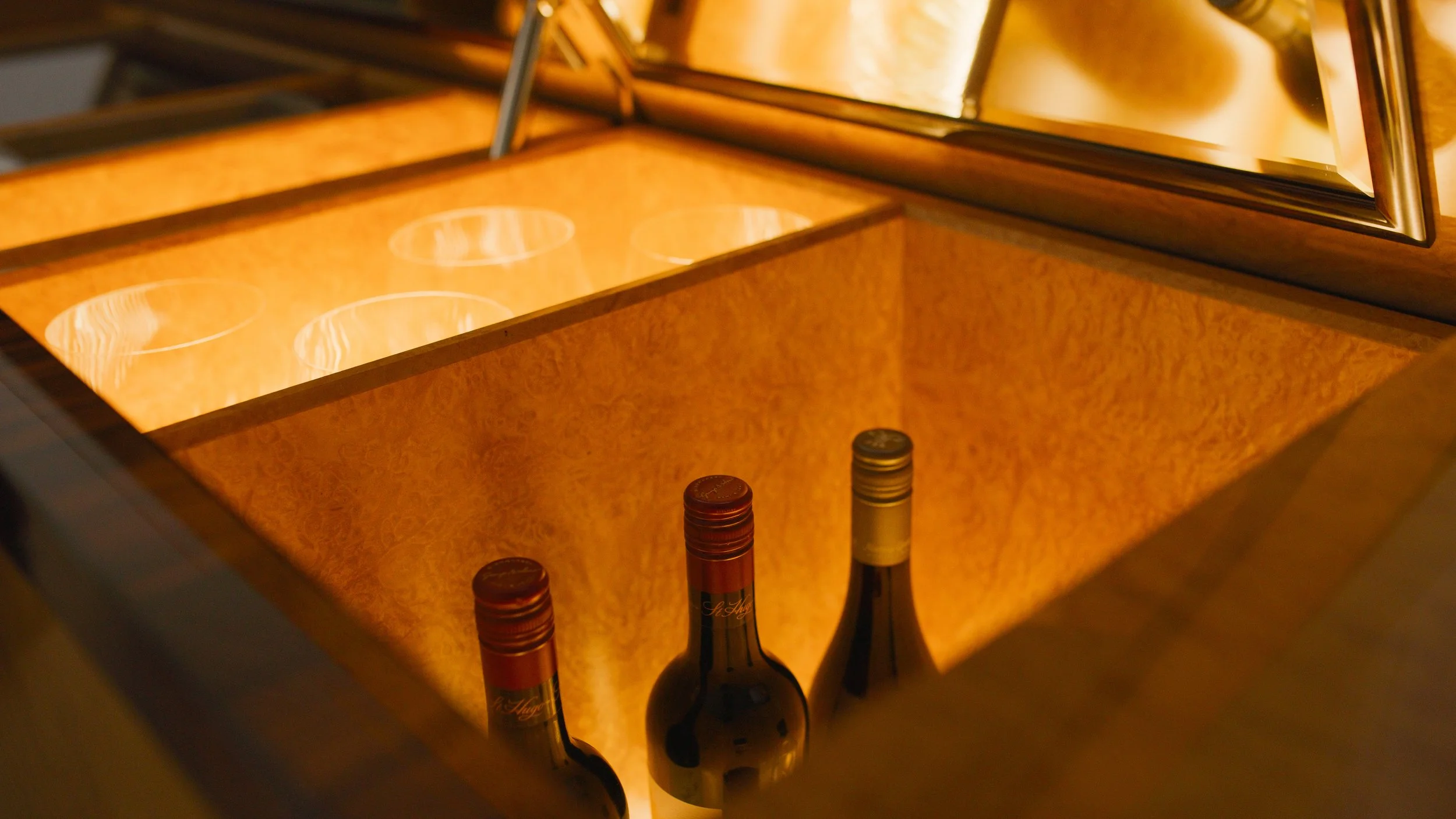 Featuring a mesmerising starburst slip-match design made from North Queensland Butt Maple. A long black-shagreen and Ebony lid that lifts on hand-polished nickel-silver gas struts with the touch of a button. Inside, a softly lit sanctuary of Ash Burr. Fitted cradles for bottles, glasses and bar tools. A custom made, double-insulated, polished stainless ice bucket and a granite-topped servery. Etched safety glass glows from beneath creating a warm glow in the glassware after dark.