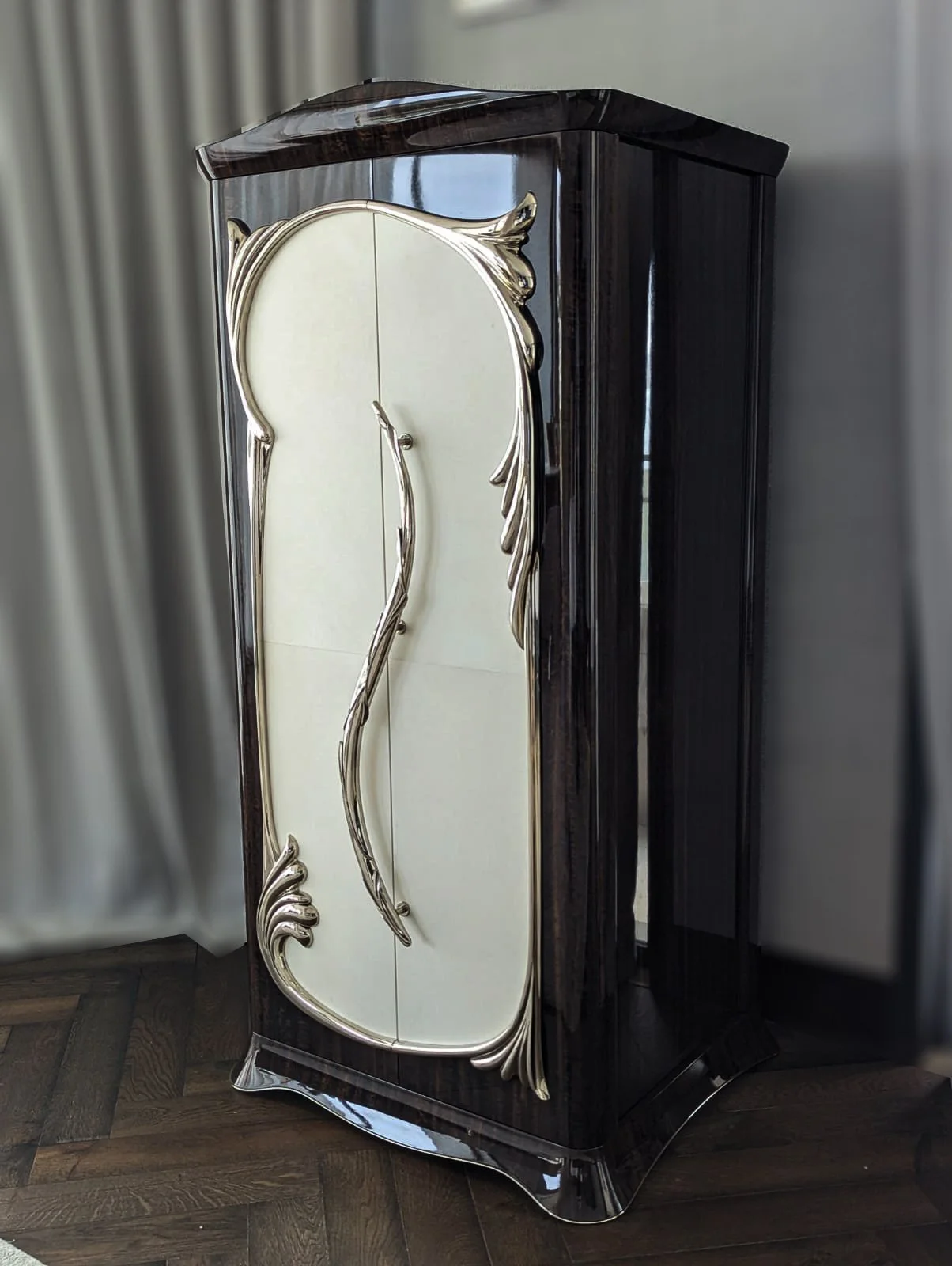 Rene sketched the first gesture. An Art Nouveau sweep, all flow and poise. From that drawing, our workshop shaped a cabinet in smoked eucalyptus, rich brown-grey, calm and luminous, its decorative work hand-carved and cast in bronze, then plated in nickel silver and hand polished until it became jewellery, catching the light and amazing the viewer’s eye.