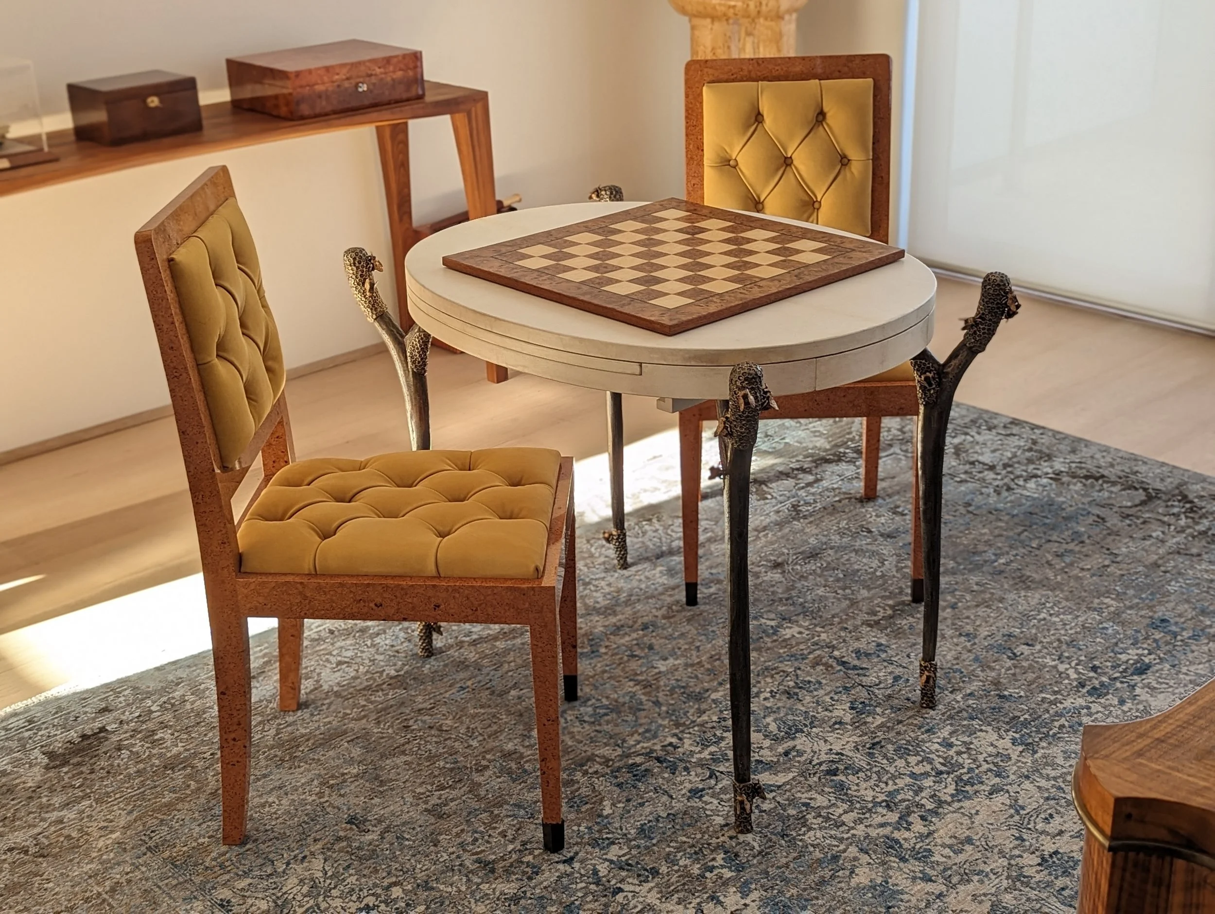 Two opposing drawers slide out with a soft whisper. Leather-lined with the finest of hand-cut dovetails, ready to cradle the chessmen. The board itself waits hidden beneath the top, revealed when the game begins.