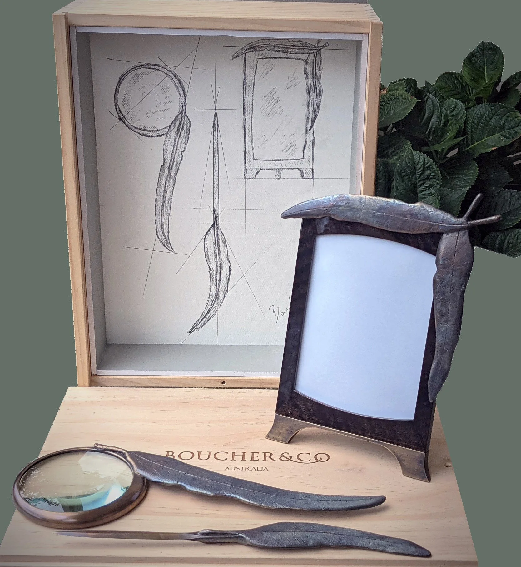 Our answer was to design and create a one-of-a-kind Desk Set in fumed Eucalyptus, its grain deep and smoky, framed with hand-carved, cast-bronze details and lined in superb hand-stitched leather. The pieces feel purposeful in the hand: a paper tray with quiet authority, a cast bronze leaf handled letter opener, sleek and wonderful in the hand, a Bronze leaf handled magnifying glass that catches the light and functions perfectly, and a photo frame to hold a moment you never want to forget.