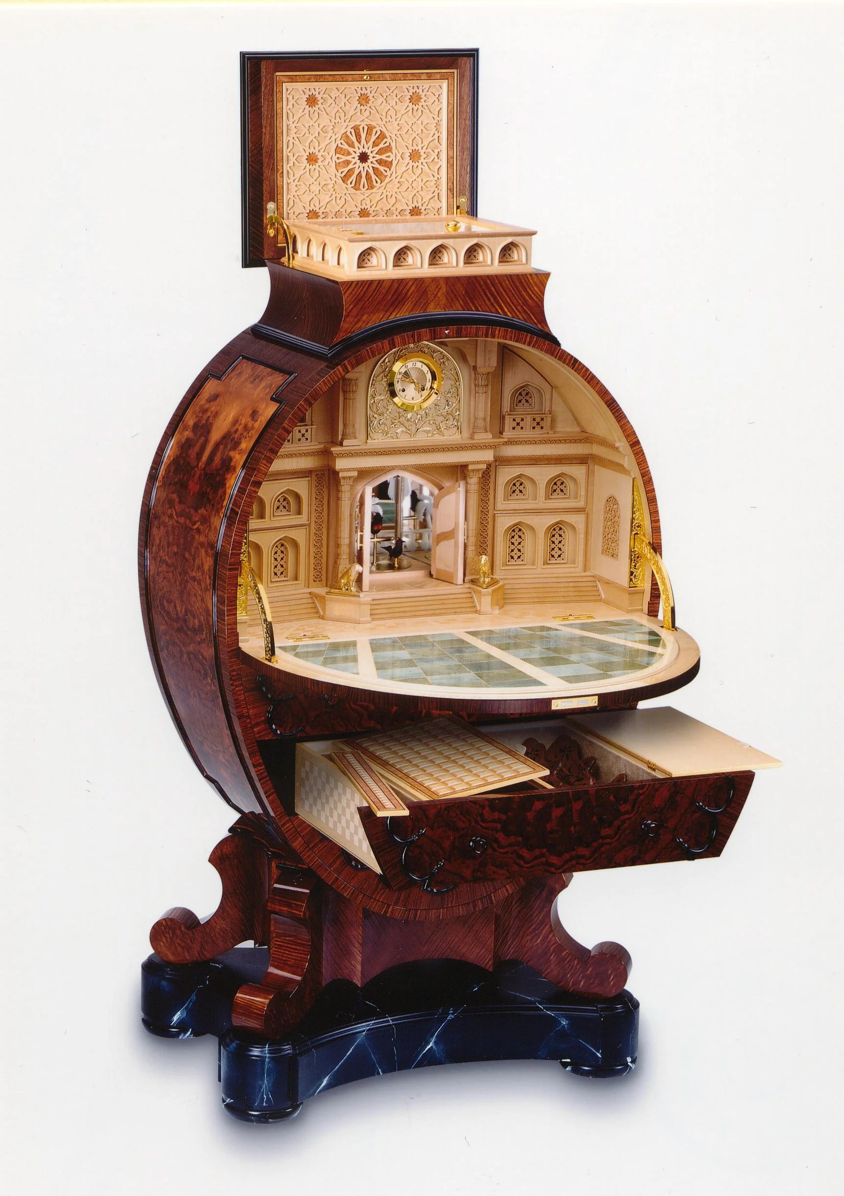 That dream refused to fade. Over the next six years, in the spaces between commissioned works, our team laboured to bring it to life. More than three thousand hours went into creating a 1.7 metre-tall oval bureau with a fold-down flap door and fitted drawers. Open it, and the palace revealed itself, balconies, fibre-optic windows, secret doors that opened by hidden mechanisms, and endless layers of fine inlay and carved surprises.